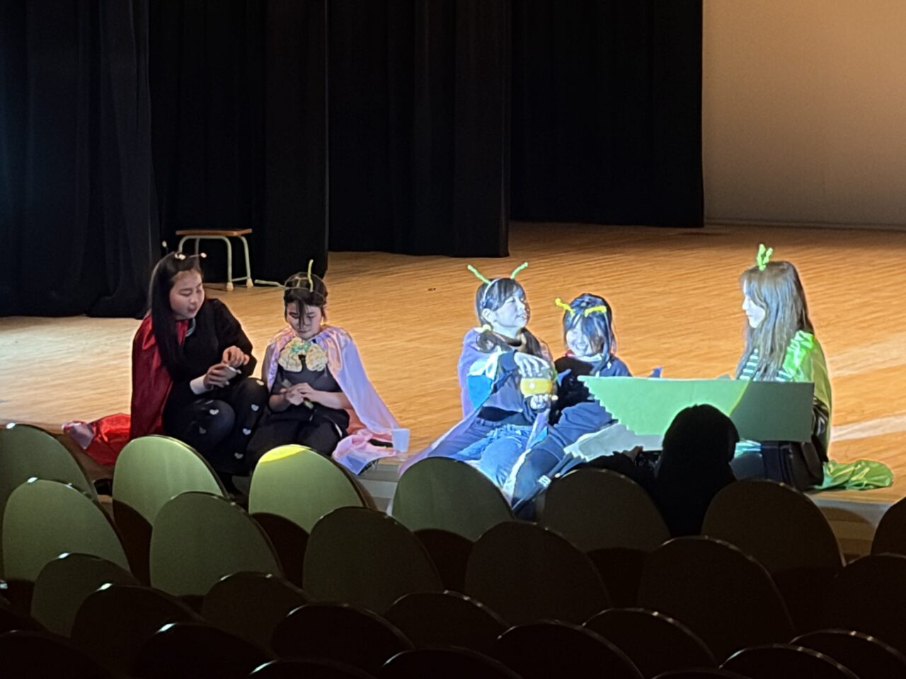本番は大きなホールで、堂々たる演技を見せてくれました。裏方担当も「次使う道具、あそこに出しておいたよ。」「30秒で転換がんばるぞ!」などまさに縁の下の力持ち的存在。役者と裏方がワンチームとなり公演をやりとげました。インフルエンザでの休校や、ギリギリまで粘った台本作り。ハラハラすることもありましたが、終わってみればロビーには晴れやかな笑顔が溢れていました。