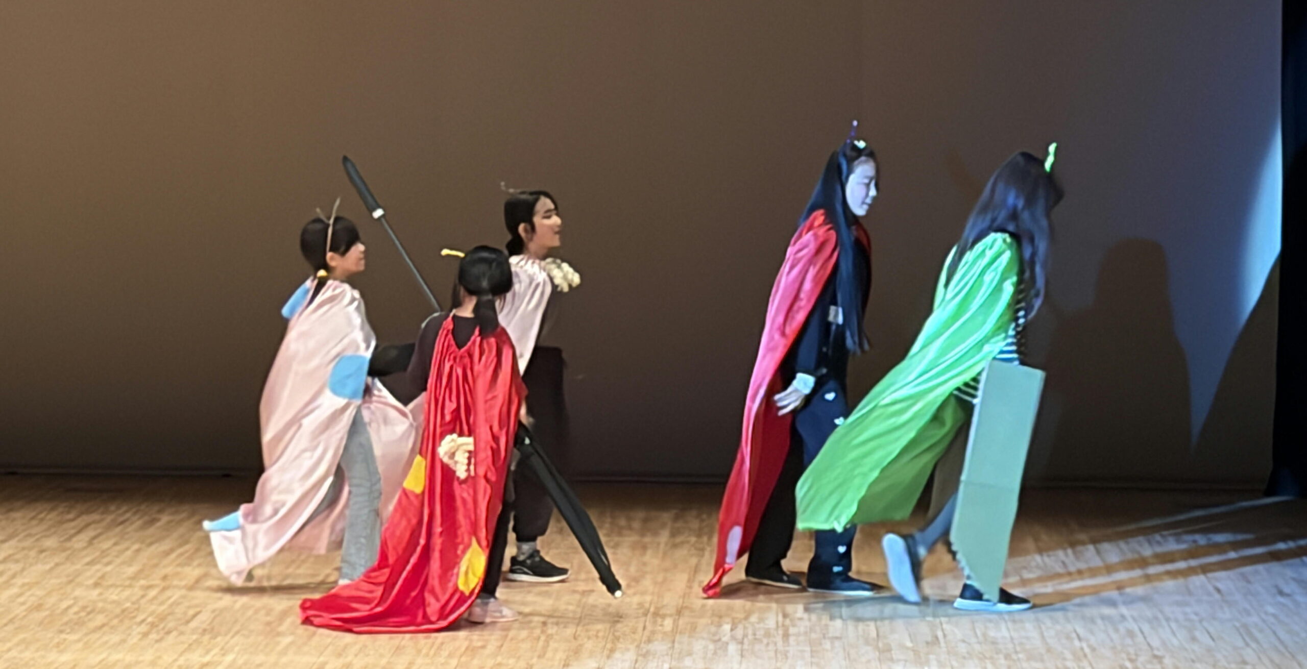 本番は大きなホールで、堂々たる演技を見せてくれました。裏方担当も「次使う道具、あそこに出しておいたよ。」「30秒で転換がんばるぞ!」などまさに縁の下の力持ち的存在。役者と裏方がワンチームとなり公演をやりとげました。インフルエンザでの休校や、ギリギリまで粘った台本作り。ハラハラすることもありましたが、終わってみればロビーには晴れやかな笑顔が溢れていました。